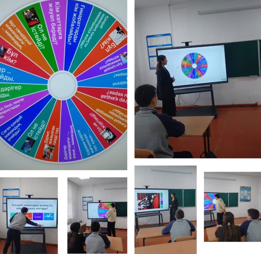 8-9 сынып оқушыларымен "Мамандықтар туралы не білемін?" тақырыбында ойын түрінде қызықты сабақ өтті. Оқушылар түрлі мамандықтармен танысып, ой сергітетін тапсырмалар орындап, өз болашағына қатысты пікірлерімен бөлісті. Сабақ өте белсенді және әсерлі өтті.