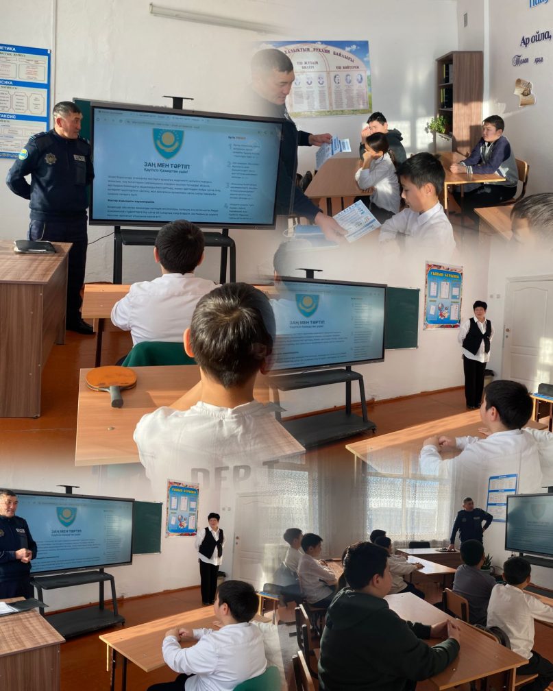Бүгін мектепте полиция инспекторы Магауов Айбар Еслямбековичтің қатысуымен «Заң мен тәртіп » атты тәрбие сағаты өтті. Шараның мақсаты – отбасылық зорлық-зомбылықтың алдын алу, оның салдарын түсіндіру және оқушылардың құқықтық сауаттылығын арттыру. Инспектор Заң мен тәртіп, зорлық-зомбылық түрлері, заң алдындағы жауапкершілік және көмек алу жолдары туралы айтты. Сондай-ақ оқушыларға өз құқықтарын білу, қиын жағдайда үлкендерге немесе арнайы органдарға хабарласу қажеттігін түсіндірді. Оқушылар сұрақтар қойып, өз ойларын ортаға салды. Шара соңында «Зорлыққа жол жоқ!» атты үндеу қабылданды.